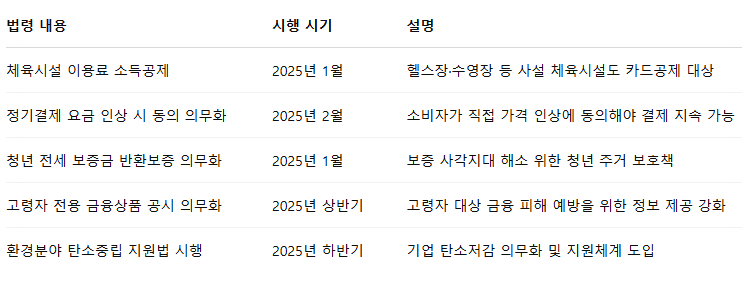 2025년에는 위의 제도 외에도 국민의 일상생활에 밀접한 영향을 미치는 다양한 법령이 새롭게 시행됩니다. 특히 ‘소비자 보호’, ‘청년 지원’, ‘세제 혜택 확대’라는 키워드 아래 많은 제도들이 개편될 예정입니다.